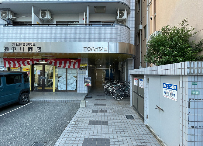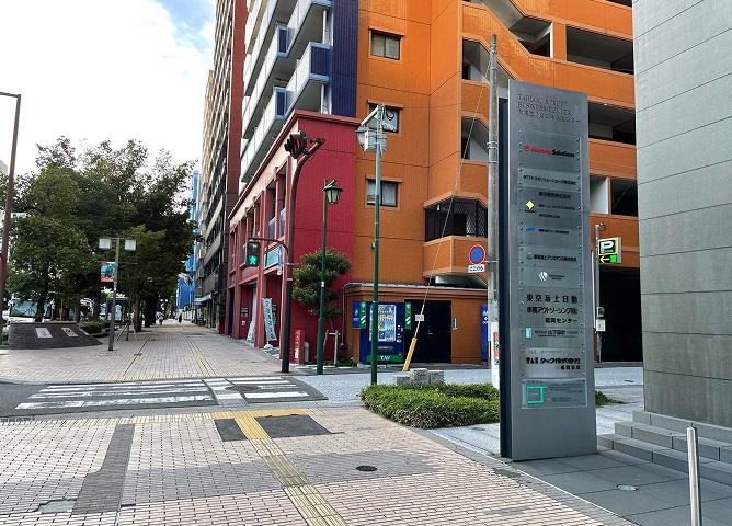 1番出口を出て、東長寺を右手に直進し、オレンジ色のマンションの手前で右に曲がります。