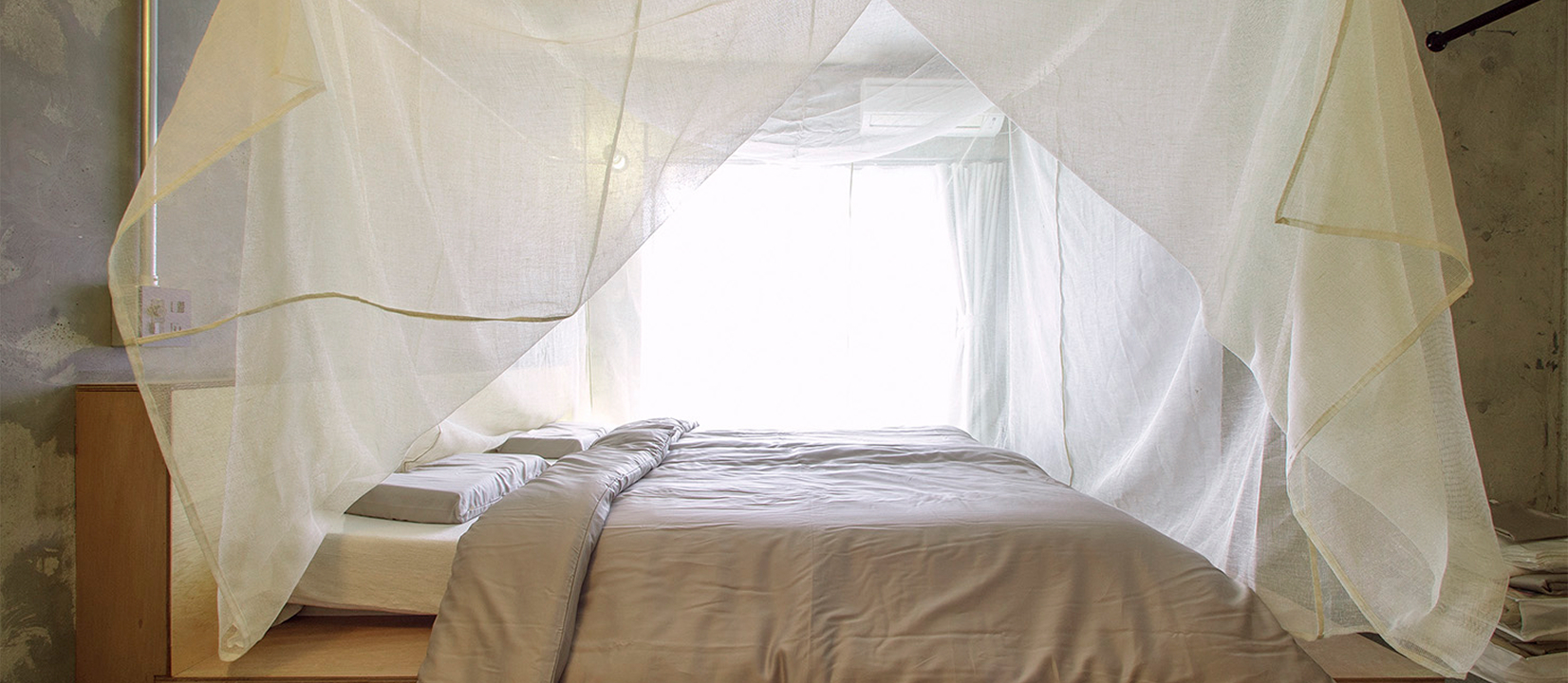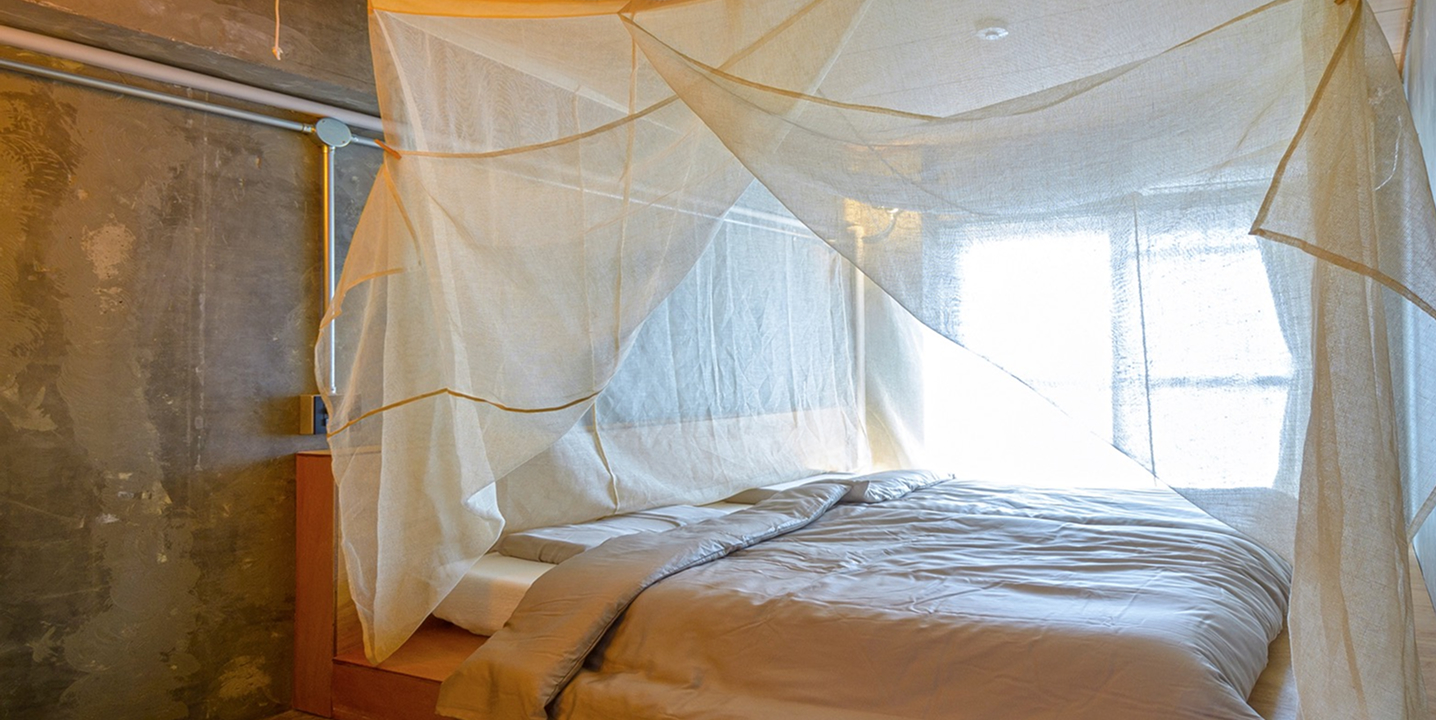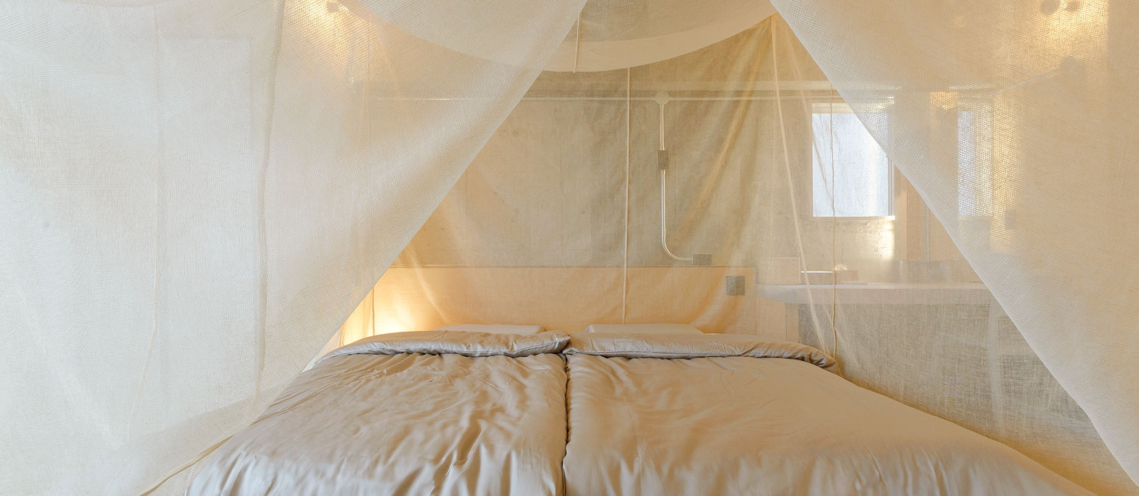 また、寝室には天然素材の麻の蚊帳をしつらえました。 蚊帳は、かつて日本の夏の暮らしに欠かせないものでしたが、 その役割は単なる防虫にとどまりません。 ゆるやかに仕切られ、包まれているという感覚が、 眠りの深さをさらに後押しします。